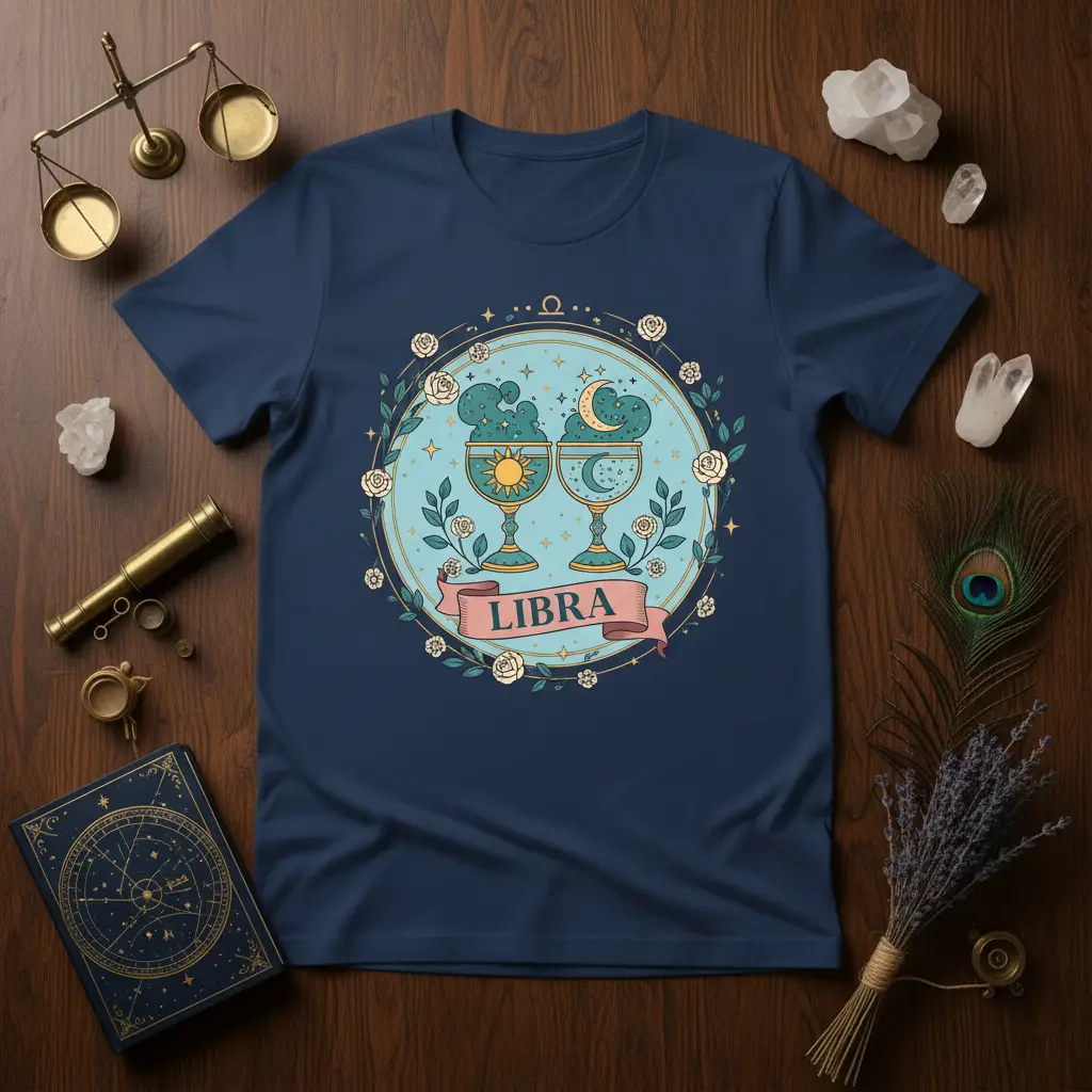 The intricate design features the beloved Libra zodiac symbol, beautifully rendered with celestial elements. Two elegant cups are depicted, one holding a bright, shining sun, symbolizing warmth and vitality, while the other cradles a serene crescent moon and twinkling stars, representing intuition and dreams. These elements are artfully enclosed within a wreath of delicate roses and cosmic accents, creating a truly enchanting visual. The word “LIBRA” is elegantly presented on a complementary pink banner, making the zodiac sign unmistakable and celebrated.