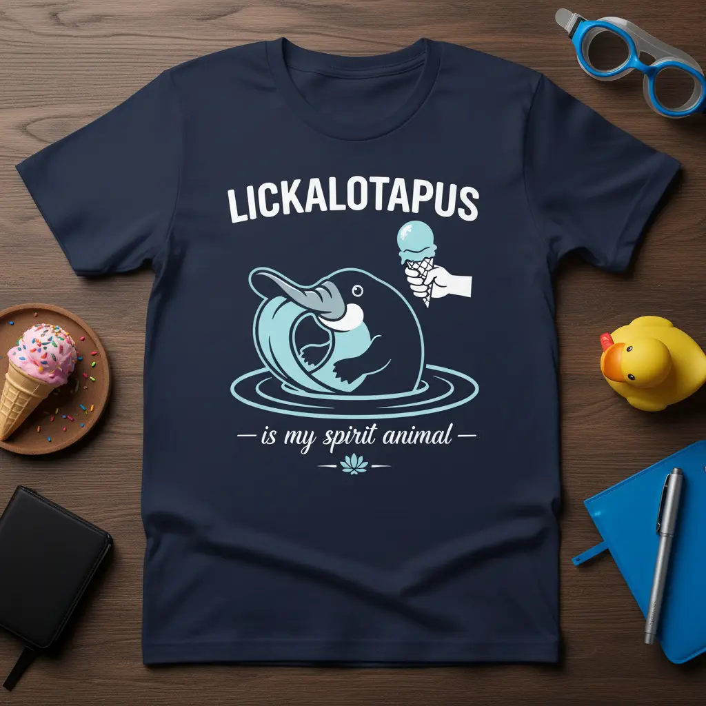 LICKALOTAPUS is my spirit animal and this t-shirt is the perfect way to showcase that unique connection. Featuring a whimsical illustration of a platypus, complete with an ice cream cone, this tee captures a sense of playful joy and individuality. It’s designed for those who appreciate quirky humor and have a special fondness for the often-overlooked charm of the platypus. This shirt is more than just apparel; it’s a statement piece that reflects a fun-loving personality and a deep appreciation for the animal kingdom’s most unusual creatures. Celebrate your spirit animal with this delightful and comfortable garment.