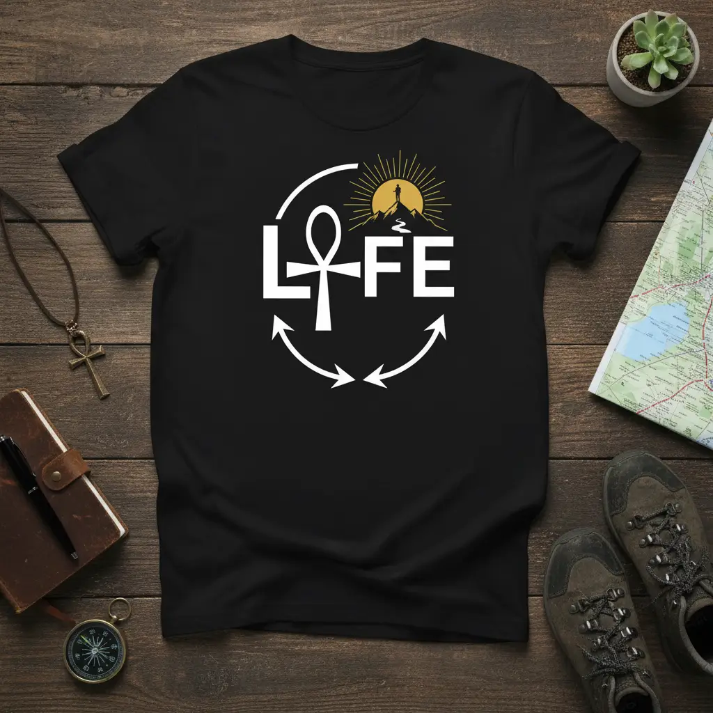 LIFE ANKH SYMBOL t-shirt is more than just apparel; it’s a statement of your adventurous spirit and your embrace of life’s profound journey. This unique design merges the ancient Egyptian symbol of life, the Ankh, with the word LIFE itself, creating a powerful visual narrative. The graphic features a determined explorer reaching the peak of a mountain under a radiant sun, encircled by symbolic arrows that represent the continuous cycle of experiences and growth. It’s perfect for anyone who finds inspiration in exploration, spirituality, and the pursuit of meaningful living.