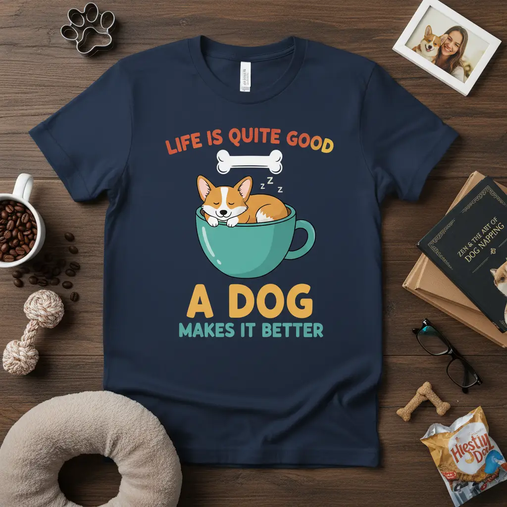 Life is quite good a dog makes it better, and this t-shirt is here to prove it! This delightful piece of apparel celebrates the incredible impact our canine companions have on our daily lives. It features a charming graphic of a corgi dog peacefully napping inside a teacup, complete with a little bone and “zzz” marks to emphasize its cozy slumber. The vibrant text beautifully complements the adorable illustration, making it a standout item for any dog lover’s wardrobe. It’s more than just a shirt; it’s a statement of love and appreciation for the furry friends who make life so much sweeter.