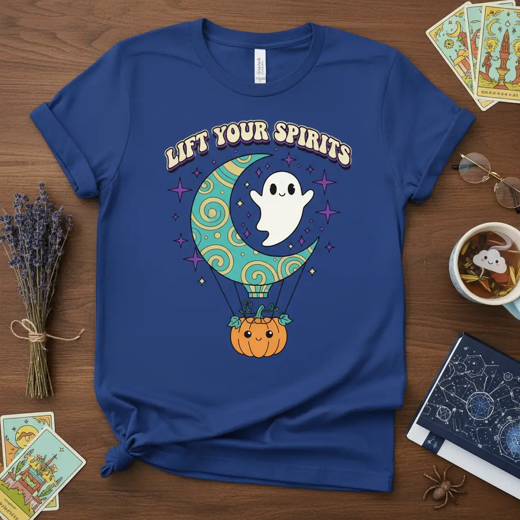 LIFT YOUR SPIRITS with this enchanting t-shirt, designed to bring a touch of whimsical charm to your wardrobe. This unique graphic tee captures the magic of Halloween and the cozy embrace of autumn with its playful design and vibrant colors. It’s more than just apparel; it’s a statement piece that celebrates the fun and spirited nature of the season. Perfect for casual wear, Halloween parties, or as a thoughtful gift for anyone who loves a bit of spooky enchantment.