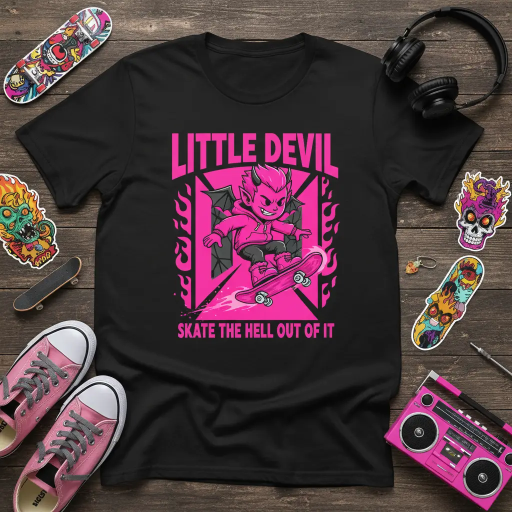 LITTLE DEVIL SKATE THE HELL OUT OF IT t-shirt is designed for those who live life on the edge and embrace their rebellious side. This unique graphic tee features a vibrant pink illustration of a mischievous little devil, complete with wings and horns, confidently riding a skateboard. The bold typography exclaims “LITTLE DEVIL” and “SKATE THE HELL OUT OF IT,” perfectly encapsulating the spirit of extreme sports and a fearless attitude. It’s more than just apparel; it’s a statement piece for anyone who loves to push boundaries and express their individuality with a touch of playful defiance.