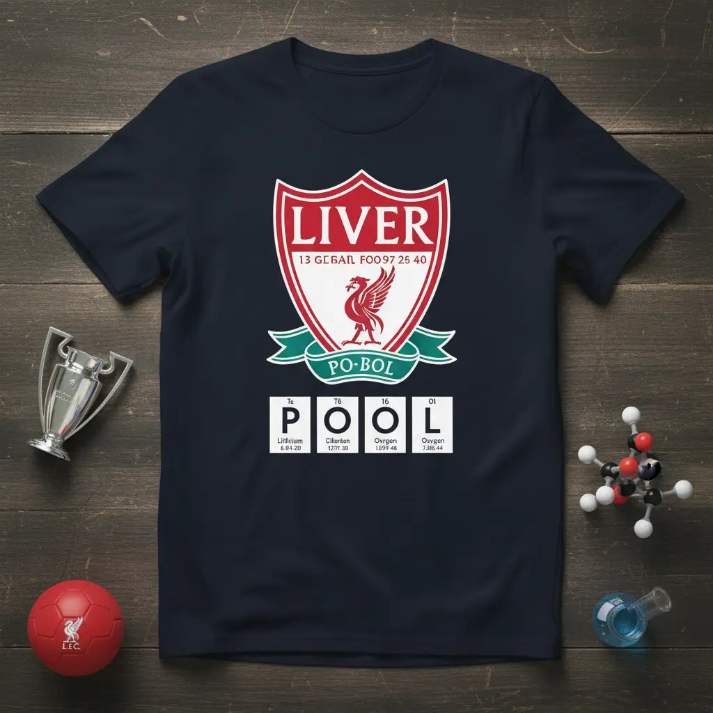 This LIVERPOOL FC Periodic Table T-Shirt design features the instantly recognizable Liverpool FC crest, complete with the iconic Liver Bird and the club’s motto. Below the crest, the team name “POOL” is ingeniously formed using chemical symbols and atomic numbers from the periodic table: P (Phosphorus), O (Oxygen), O (Oxygen), and L (Lithium). This creative interpretation offers a unique talking point and a subtle nod to the scientific representation of elements, appealing to fans who appreciate clever design.