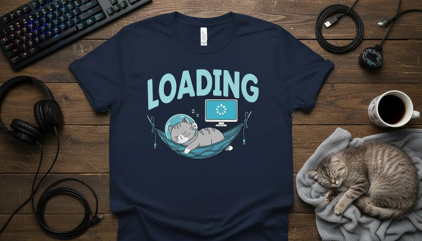 Loading Cat T-Shirt designs are perfect for anyone who appreciates a bit of humor and comfort in their wardrobe. This particular tee features a delightful graphic that captures the essence of taking a break, whether you’re a tech enthusiast, a programmer, or simply a cat lover who understands the need for downtime. The design showcases a cute cat in a hammock, complete with a space helmet, symbolizing a deep state of relaxation while a computer screen displays a loading icon. It’s a playful and relatable image that resonates with the modern digital lifestyle.