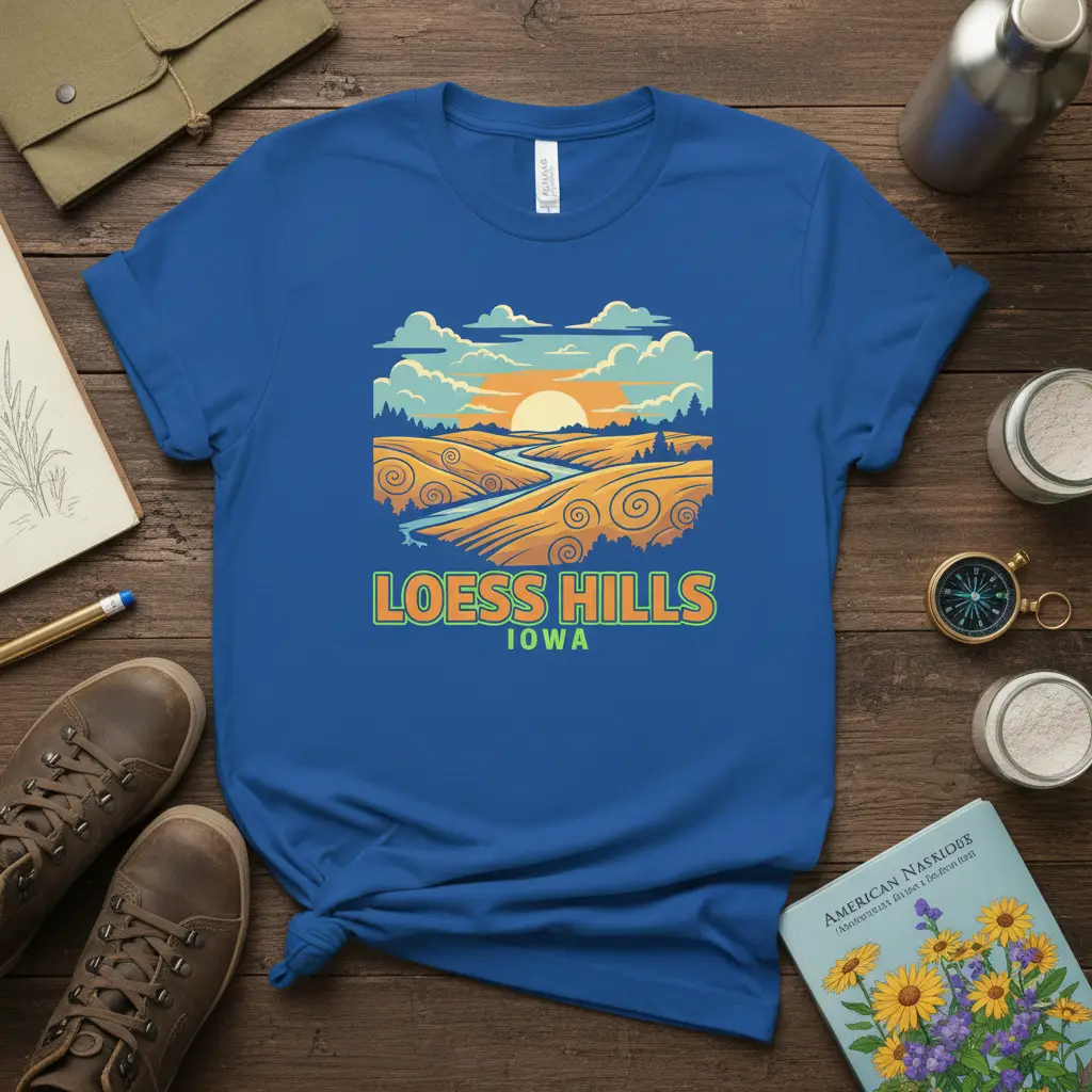 Loess Hills Iowa landscape design on a comfortable tee celebrates the unique natural beauty of this iconic region. This shirt is perfect for anyone who appreciates scenic views, enjoys road trips, or wants to showcase their Iowa pride. The vibrant artwork captures the rolling hills, winding rivers, and picturesque sunsets that define this special place, making it a wearable piece of art for any nature lover.
