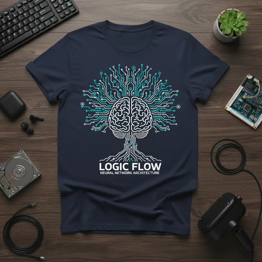 The phrase “LOGIC FLOW” is presented boldly, emphasizing the systematic and structured nature of neural processing. Below it, “NEURAL NETWORK ARCHITECTURE” provides clear context, making the design both artistic and informative. This combination ensures that the wearer not only sports a cool graphic but also communicates an appreciation for the underlying principles of artificial intelligence and computing.