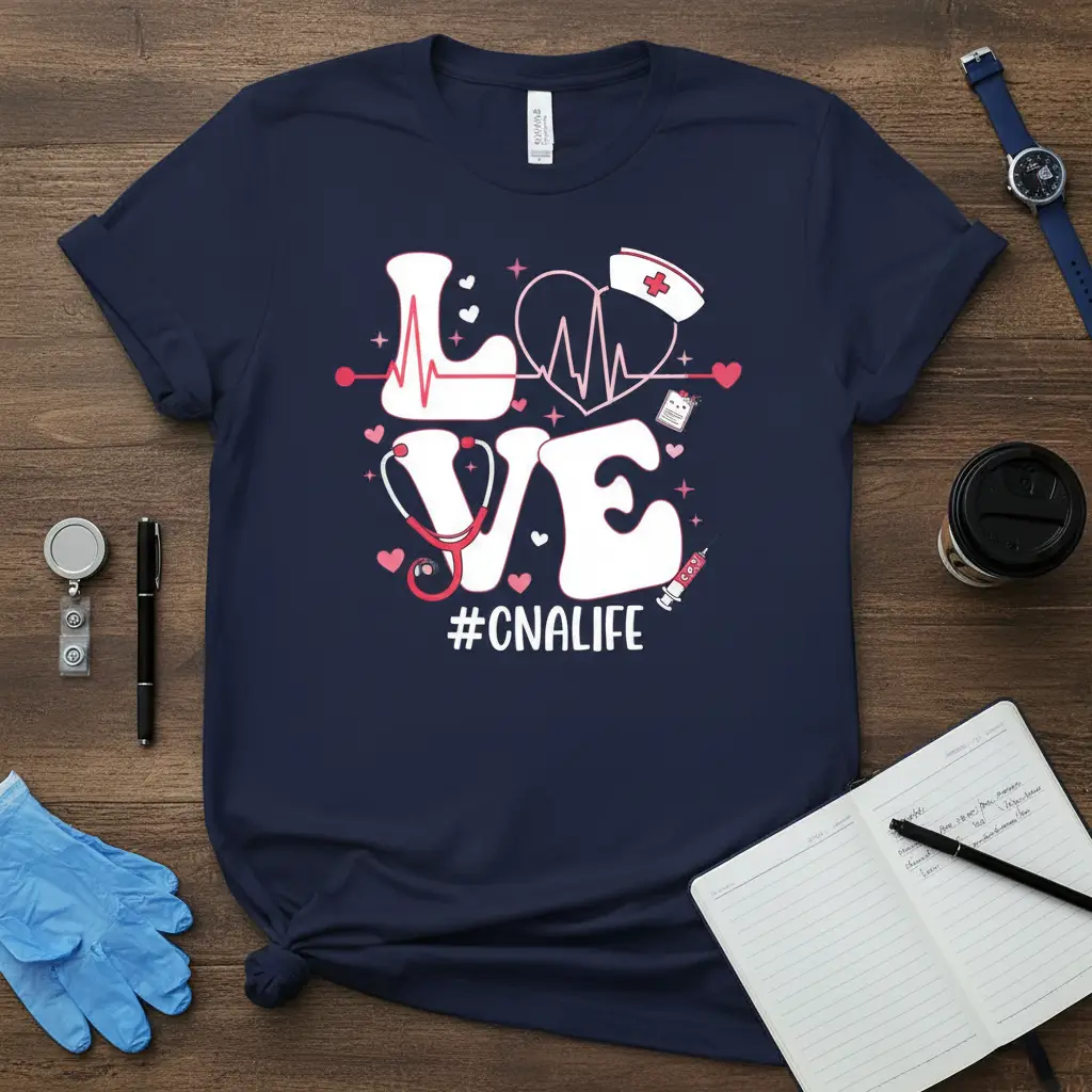 This exclusive t-shirt features a unique design that beautifully merges the concept of love with the reality of #CNALIFE. The graphic incorporates iconic medical symbols, including a heartbeat EKG line, a stethoscope, and a classic nurse’s cap, all artfully arranged to spell out “LOVE.” It’s a visual representation of the care and commitment CNAs bring to their patients, embodying the very essence of their noble profession.