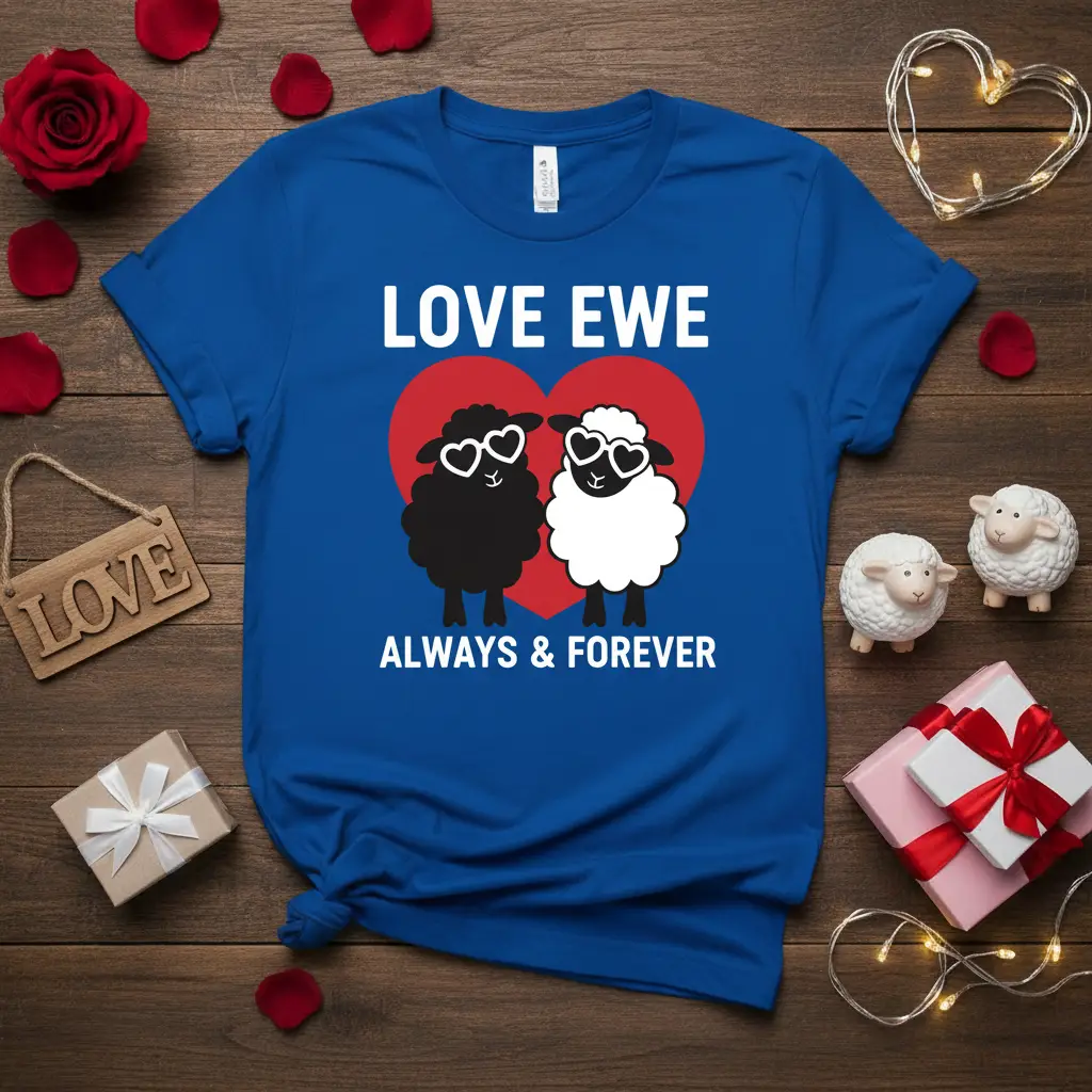 This t-shirt is designed to celebrate the unconditional love shared between partners. The “Love Ewe” pun is a clever and cute way to express your feelings, and the “Always & Forever” tagline reinforces the depth of your commitment. The graphic of two sheep, symbolizing companionship and loyalty, further enhances the romantic theme of the design. Wear it together with your partner for a coordinated look or gift it as a standalone symbol of your enduring affection.