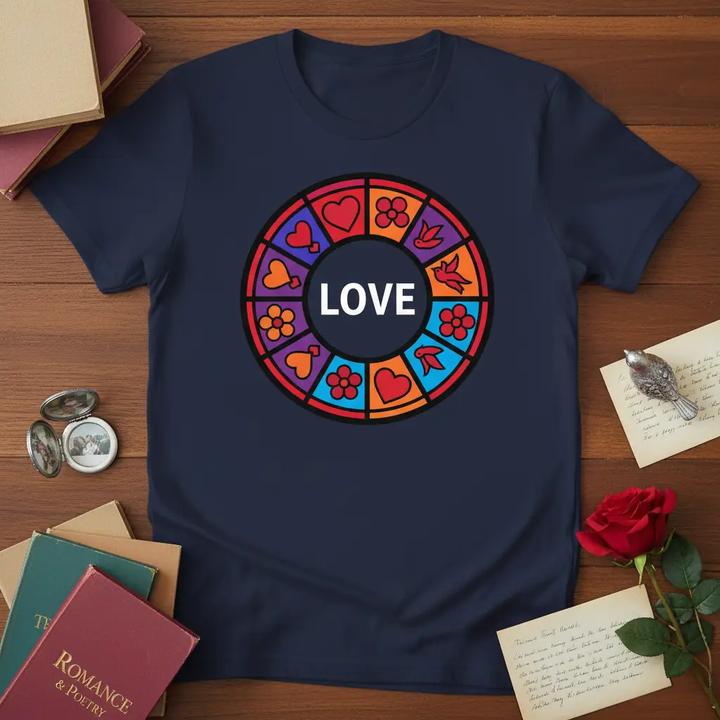 LOVE is a universal language, and this t-shirt is designed to help you express it with style and vibrancy. Featuring a captivating circular design reminiscent of stained glass, this piece prominently displays the word “this design” at its core, radiating positivity. Surrounding the central message are colorful segments adorned with charming hearts, cheerful flowers, and graceful birds, each element symbolizing different facets of affection and peace. It’s more than just apparel; it’s a wearable statement of hope and connection, perfect for brightening any day. This tee is crafted to be a comfortable and inspiring addition to your wardrobe.
