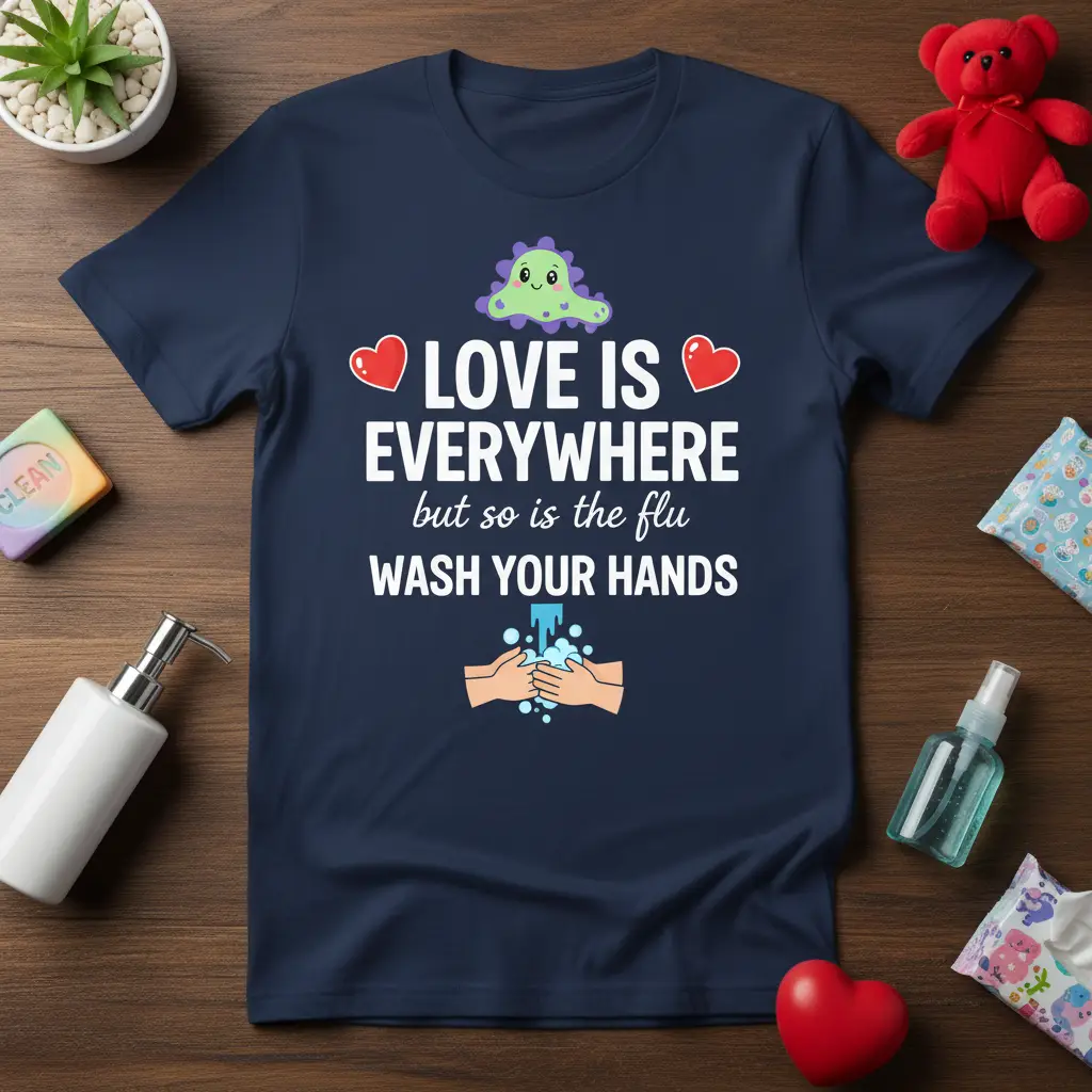 LOVE IS EVERYWHERE but so is the flu WASH YOUR HANDS t-shirt is more than just apparel; it’s a statement promoting essential health practices with a touch of humor. This unique design serves as a constant reminder to stay vigilant about hygiene, especially in today’s world. It cleverly balances a positive message about love with the practical necessity of hand washing to combat the flu. Perfect for anyone who appreciates witty social commentary and wants to subtly encourage healthy habits among friends and family.