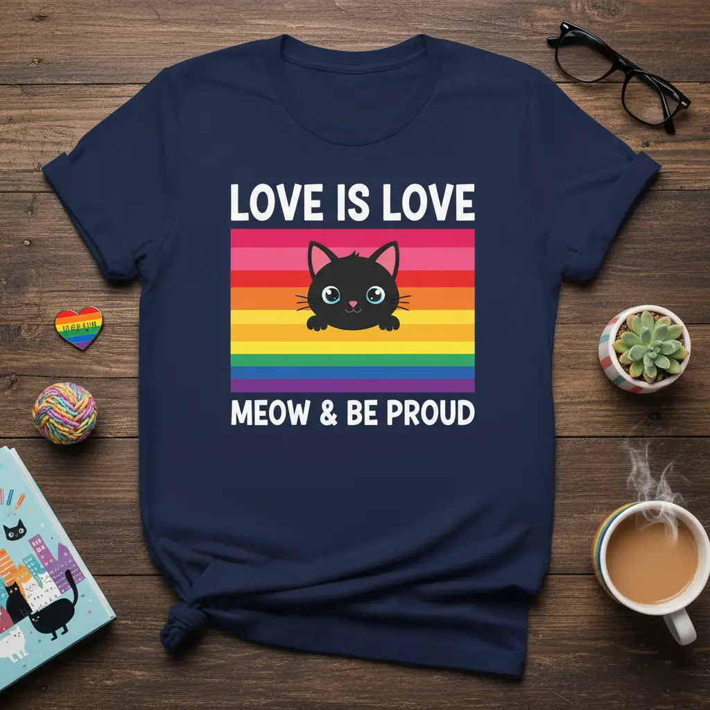 This shirt is designed to be a conversation starter, encouraging dialogue about acceptance and the importance of LGBTQ+ rights. The playful cat element adds a unique and memorable touch to the overall message, making it appealing to a wide audience. It’s more than just clothing; it’s a symbol of belonging and a beacon of hope. By wearing this tee, you’re not only expressing your personal style but also contributing to a larger movement of love and understanding. It’s a simple yet powerful way to show the world that you stand for love in all its beautiful forms.