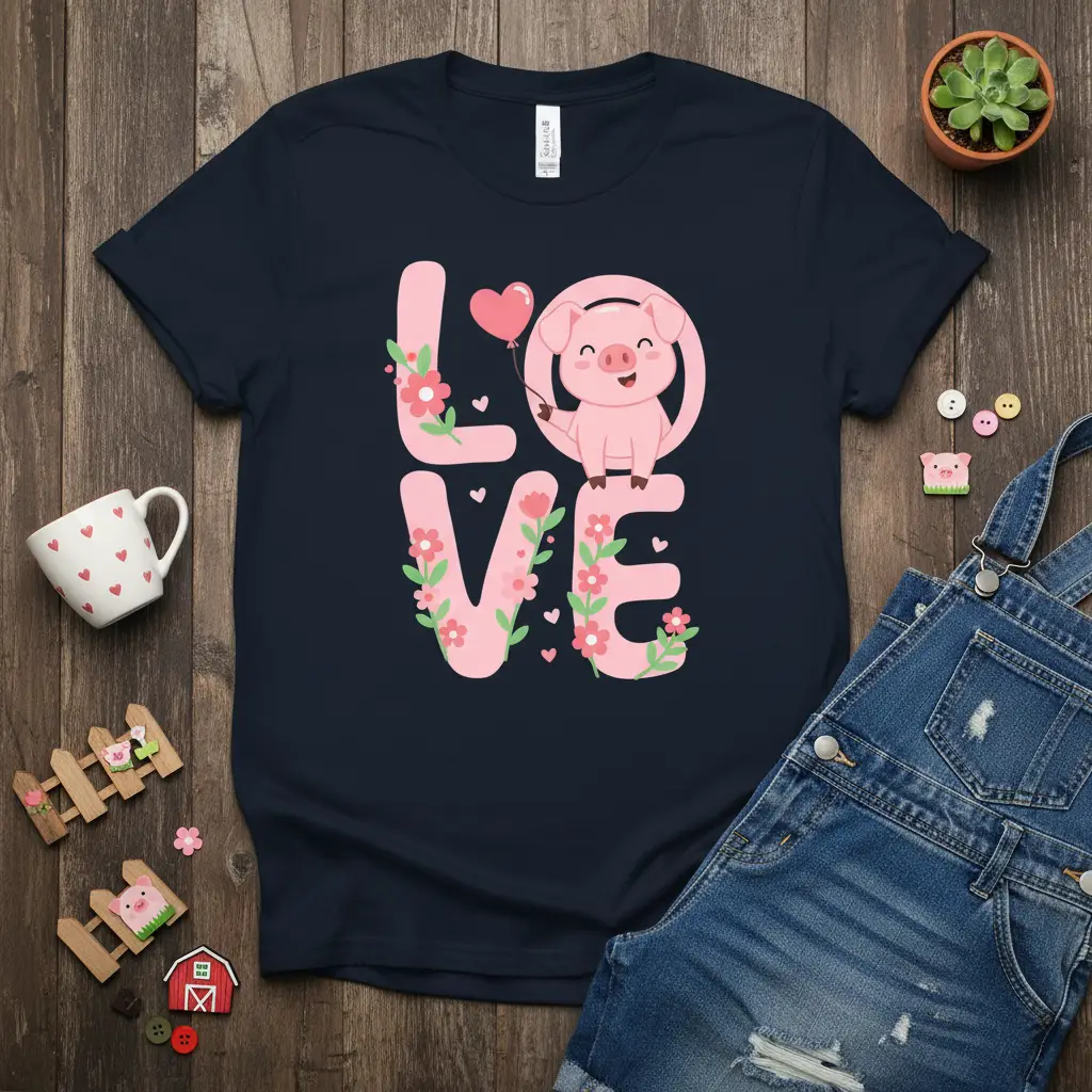 This charming t-shirt showcases the word “LOVE” in a vibrant pink hue, intricately decorated with delicate green leaves and cheerful pink blossoms. At the heart of the design, a cute pink pig is perched playfully on the letter ‘O’, holding a bright red heart-shaped balloon. This imagery creates a feeling of joy, warmth, and pure affection, making it an ideal gift for anyone who cherishes pigs or simply loves cute animal graphics. The overall design is crafted to be both stylish and heartwarming, ensuring it stands out.