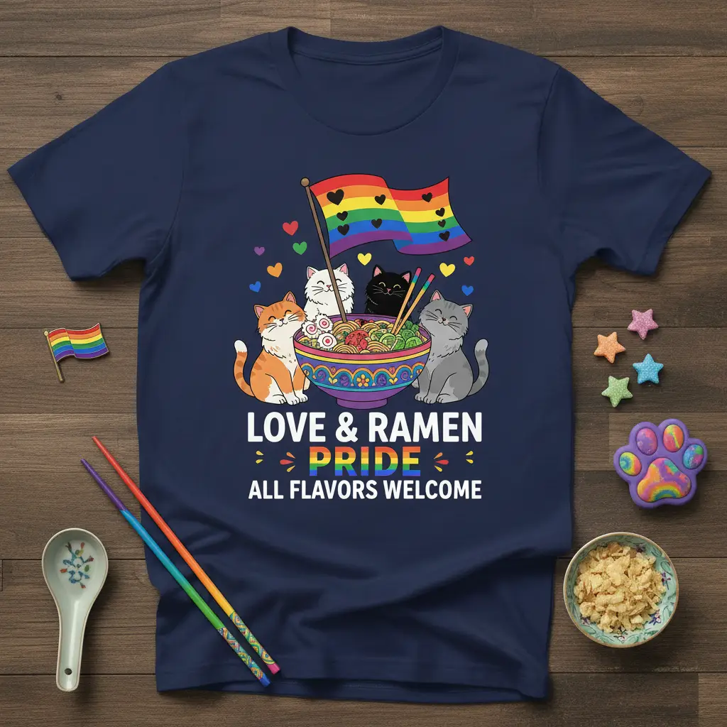 Wearing this tee is a statement of solidarity and a celebration of the vibrant tapestry of human experience. It’s perfect for anyone looking to add a splash of color and meaning to their everyday style. Embrace the spirit of pride and the comfort of a good bowl of ramen with this special garment.