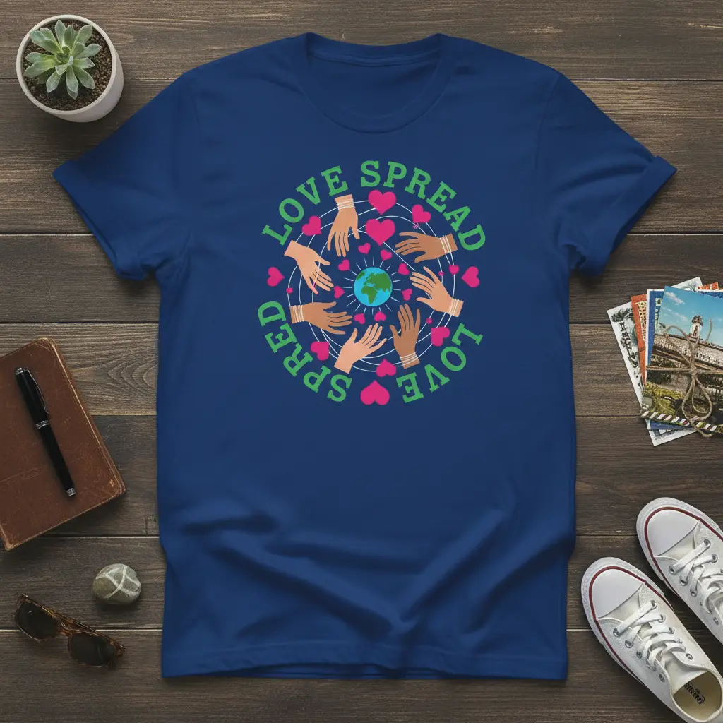 Love Spread Love Spread is more than just a phrase; it’s a philosophy that resonates deeply with the desire for a more connected and compassionate world. This t-shirt embodies that sentiment, featuring a powerful circular design that visually communicates the essence of global unity and positive energy. The intricate artwork showcases diverse hands reaching towards the Earth, symbolizing our shared humanity and the collective effort needed to foster kindness. Each element of the design, from the gentle curve of the text to the vibrant hearts, works together to create a wearable statement of peace and goodwill.