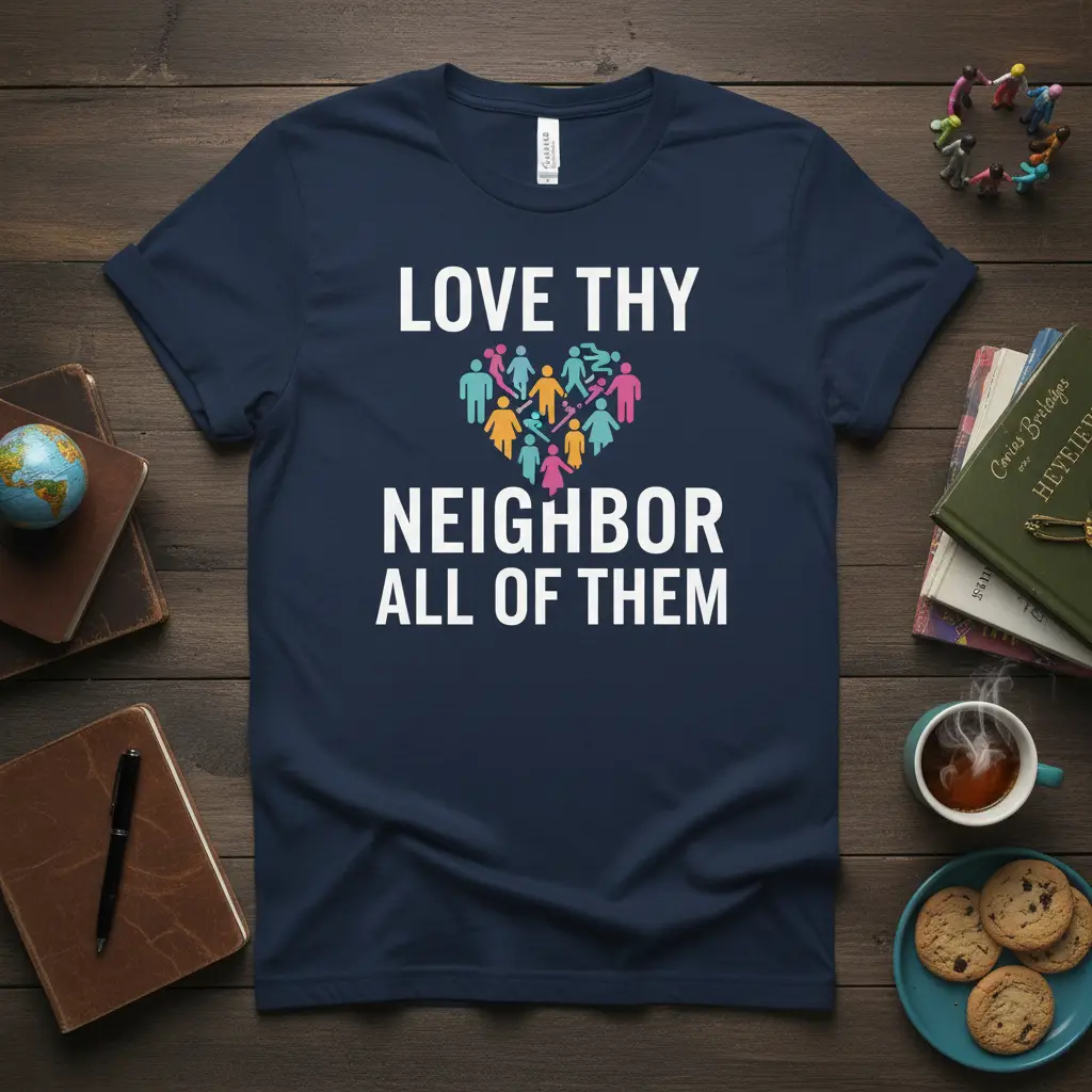 This t-shirt prominently displays the powerful message “LOVE THY NEIGHBOR ALL OF THEM” in clear, bold white lettering. The design is enhanced by a vibrant heart graphic composed of various human icons, representing the beautiful diversity of humanity. Each figure, depicted in different colors and sizes, signifies that our love and respect should extend to every individual, regardless of their background or differences.