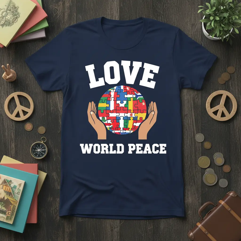 This t-shirt is designed for individuals who champion peace and global cooperation. The striking graphic depicts two hands gently holding a globe made entirely of puzzle pieces, each representing a different nation’s flag. This visual metaphor powerfully communicates the idea that every part of the world is interconnected and essential for achieving true peace. It’s a wearable reminder that love and understanding are the building blocks of a united planet.