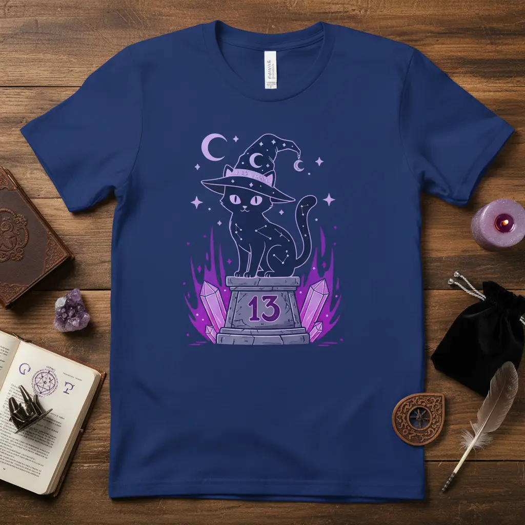 Lucky Cat 13 Witch Hat designs are perfect for anyone who loves a touch of magic and feline charm in their wardrobe. This unique graphic tee captures the essence of mystery and good fortune, featuring a striking black cat adorned with a starry witch hat. It stands on a pedestal, proudly displaying the number 13, surrounded by glowing purple crystals and celestial motifs like moons and stars. It’s more than just apparel; it’s a statement piece that resonates with those who appreciate the mystical and the enchanting aspects of life. This design is sure to become a favorite for its unique artistry and captivating theme.