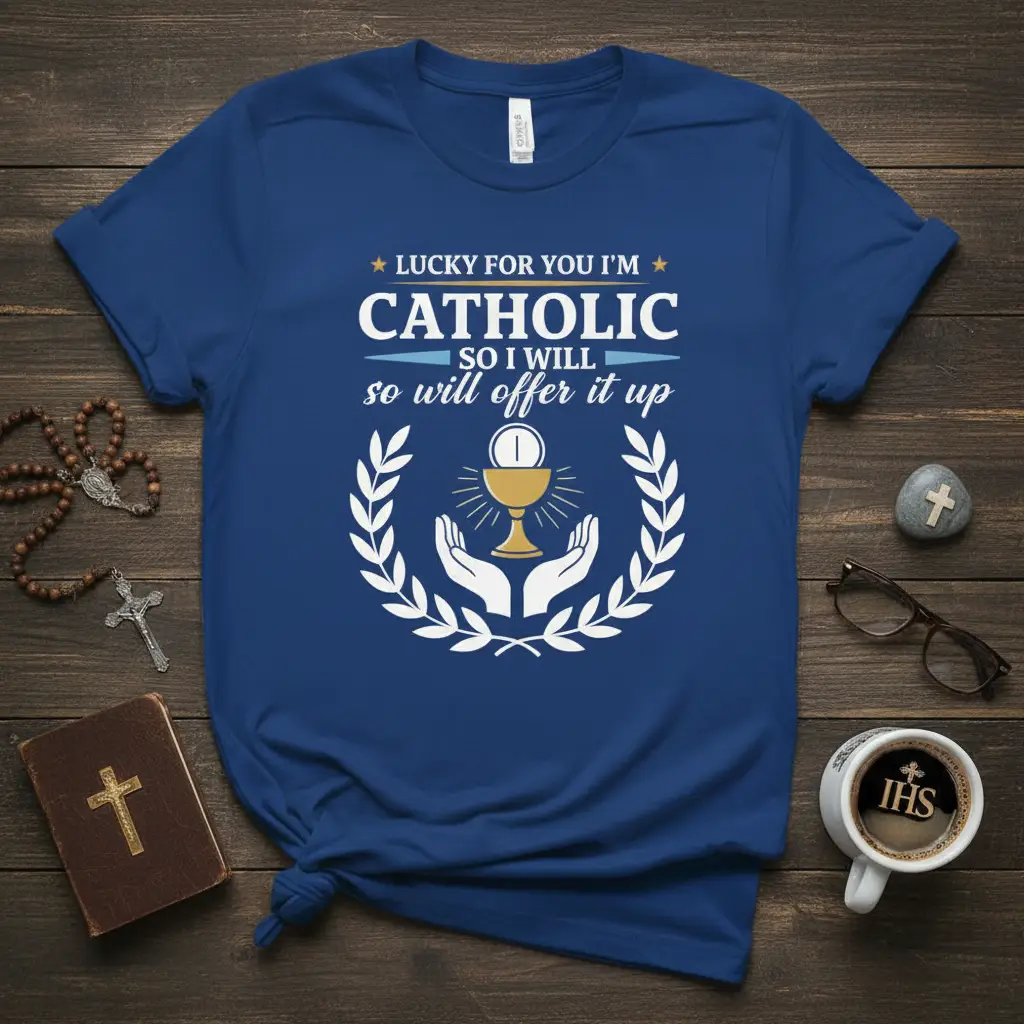 Searching for the perfect gift for a Catholic friend or family member? This “Lucky For You I’m Catholic So I Will So Will Offer It Up” t-shirt is an ideal choice. It’s a thoughtful present for birthdays, holidays, confirmations, or any occasion celebrating faith. The shirt carries a deep spiritual message that is sure to be appreciated by anyone who holds their Catholic beliefs close to their heart.