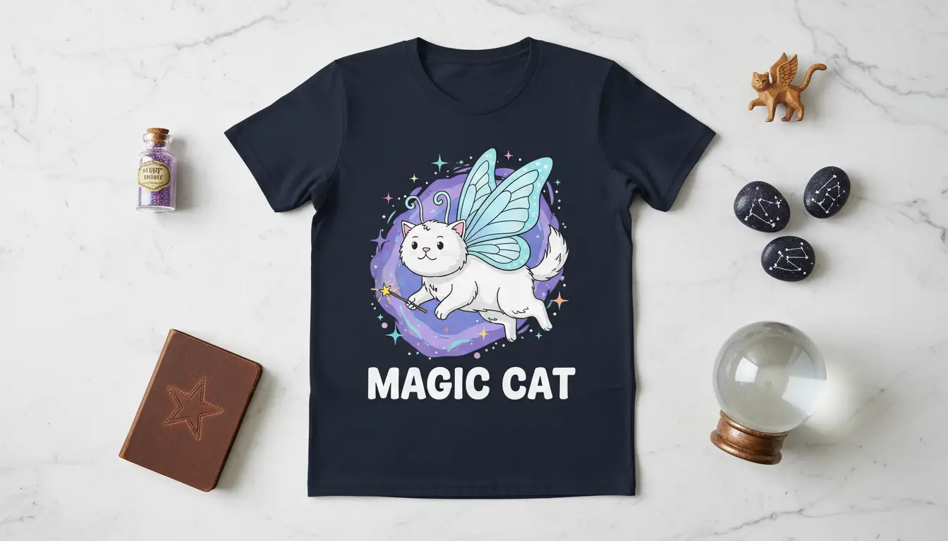Pick from Black, Navy, Royal, Dark Heather, Red, and White to match your mood and wardrobe staples. Each colorway keeps the MAGIC CAT design clear and photo-ready for everyday wear.