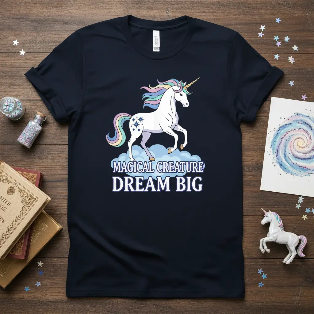 Pick from Black, Navy, Royal, Dark Heather, Red, and White to match your mood and wardrobe staples. Each colorway keeps the MAGICAL CREATURE DREAM BIG design clear and photo-ready for everyday wear.