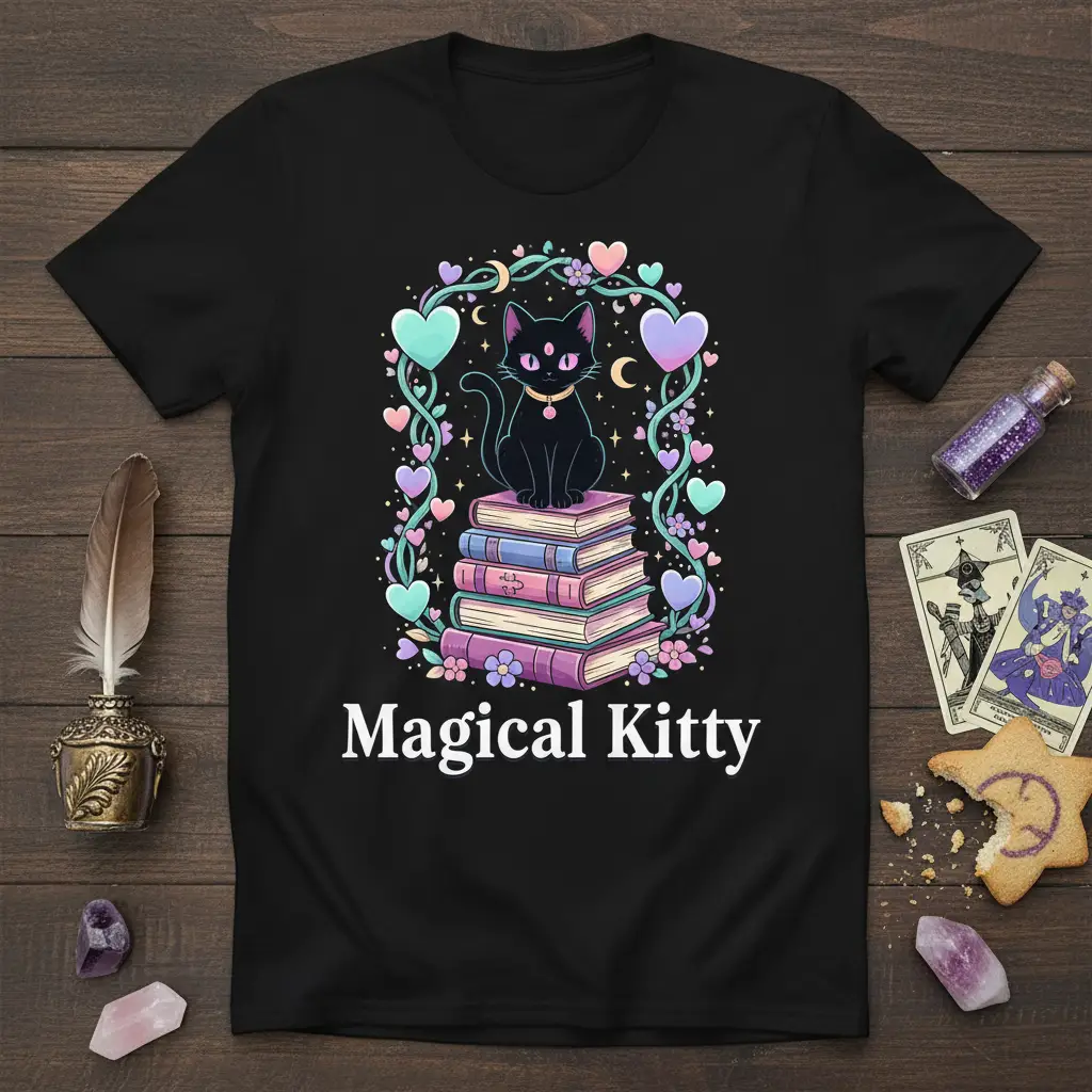 The “Magical Kitty” graphic is rendered with a soft, dreamlike quality, making it an ideal choice for those who appreciate subtle, artistic designs. Whether you’re a devoted cat parent, an avid reader, or someone who simply loves a touch of the mystical, this tee is sure to resonate with your personal style and passions.