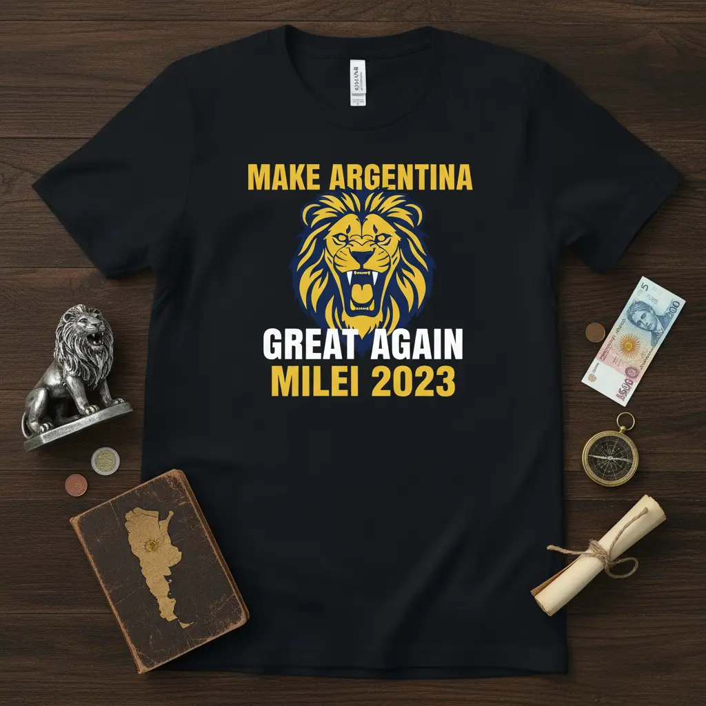 This exclusive t-shirt proudly displays the “MAKE ARGENTINA GREAT AGAIN MILEI 2023” slogan, making it a must-have for any dedicated Milei supporter. The design features bold, eye-catching typography paired with a powerful roaring lion graphic, symbolizing strength and leadership. It’s the perfect way to show your allegiance during election season and beyond. This apparel is designed to be durable and comfortable, ensuring you can wear your message with confidence.