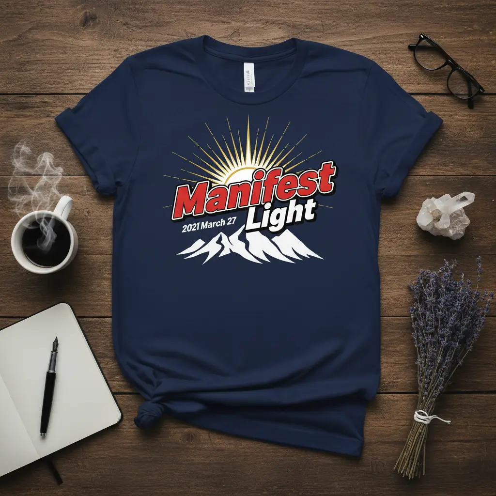 This striking t-shirt proudly displays the phrase “Manifest Light” alongside the significant date “2021 March 27.” This Manifest Light 2021 March 27 design is enhanced by a vibrant sunburst graphic rising above majestic mountains, symbolizing illumination and the dawn of new possibilities. It serves as a constant visual cue to focus on your aspirations and to actively bring them into being. This apparel is perfect for those who resonate with spiritual practices and the law of attraction.