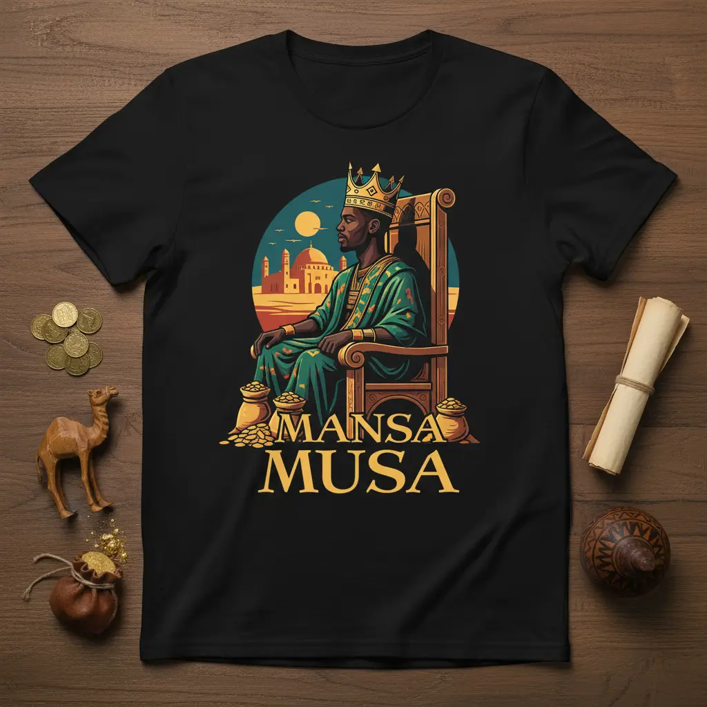 Mansa Musa, the legendary king of the Mali Empire, is brought to life on this striking graphic t-shirt, offering a unique way to connect with one of history’s most fascinating and wealthiest figures. This apparel is more than just clothing; it’s a wearable tribute to African heritage, historical significance, and opulent rule. The design captures the essence of his reign, making it a standout piece for history enthusiasts and fashion-forward individuals alike. Wear a piece of history and spark conversations about this design’s incredible legacy.