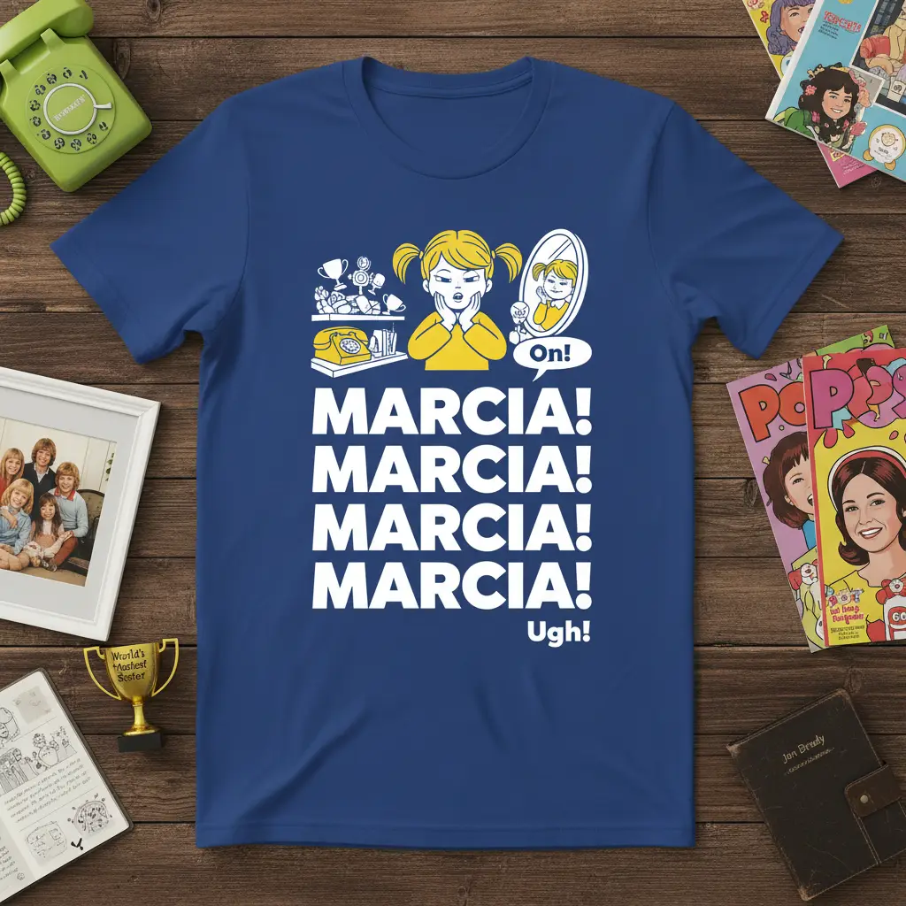 Marcia Marcia Marcia Marcia! This iconic phrase is instantly recognizable to fans of classic television and pop culture. This t-shirt captures that unforgettable moment with a fun, retro design that’s sure to bring a smile to your face. It’s the perfect way to showcase your appreciation for a beloved era of television and its enduring characters. Whether you’re a long-time fan or discovering the magic for the first time, this tee is a fantastic addition to any wardrobe. Get ready to turn heads and spark conversations with this nostalgic piece.
