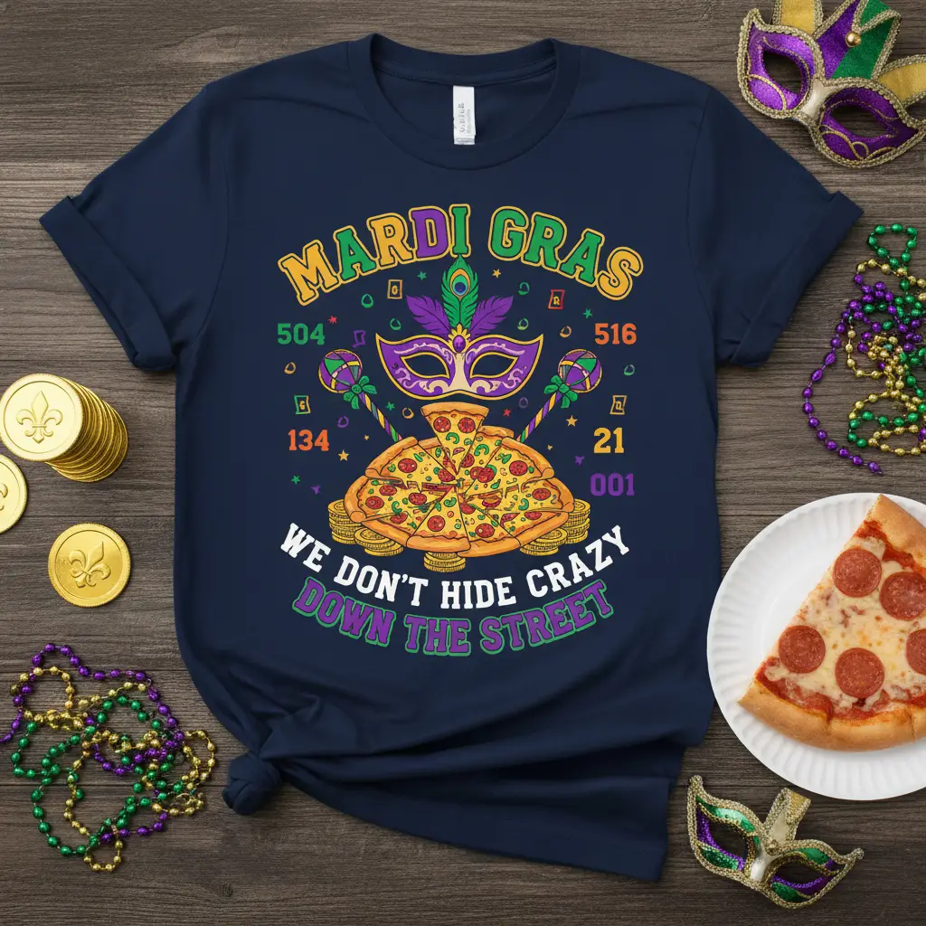 WE DON’T HIDE CRAZY DOWN THE STREET this Mardi Gras season with a t-shirt that perfectly captures the festive spirit and a love for delicious pizza. This unique design is ideal for anyone who wants to celebrate Carnival in style, combining iconic Mardi Gras imagery with a fun, relatable slogan. It’s more than just a shirt; it’s a statement piece that invites everyone to join the revelry and embrace the wild side of the celebration. Get ready to turn heads and spread cheer with this eye-catching apparel.