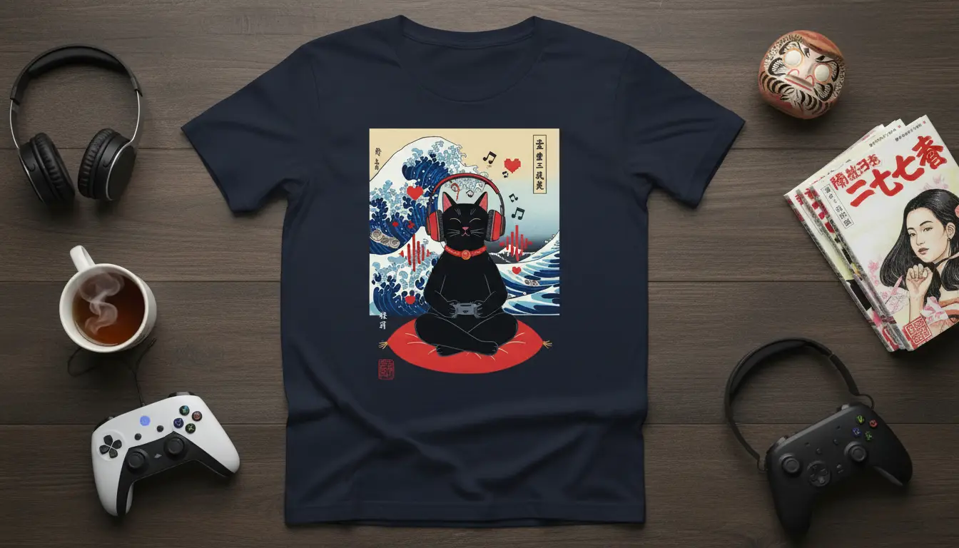 Inspired by the rich visual language of Japanese art, this design captures the spirit of contemplation and modern hobbies. The composition is carefully balanced, with the meditating cat as the clear focal point, drawing the viewer into its tranquil world. The subtle inclusion of musical notes and hearts around the cat further enhances the theme of enjoyment and peaceful immersion. Every element is thoughtfully placed to create a harmonious and visually appealing artwork that stands out.