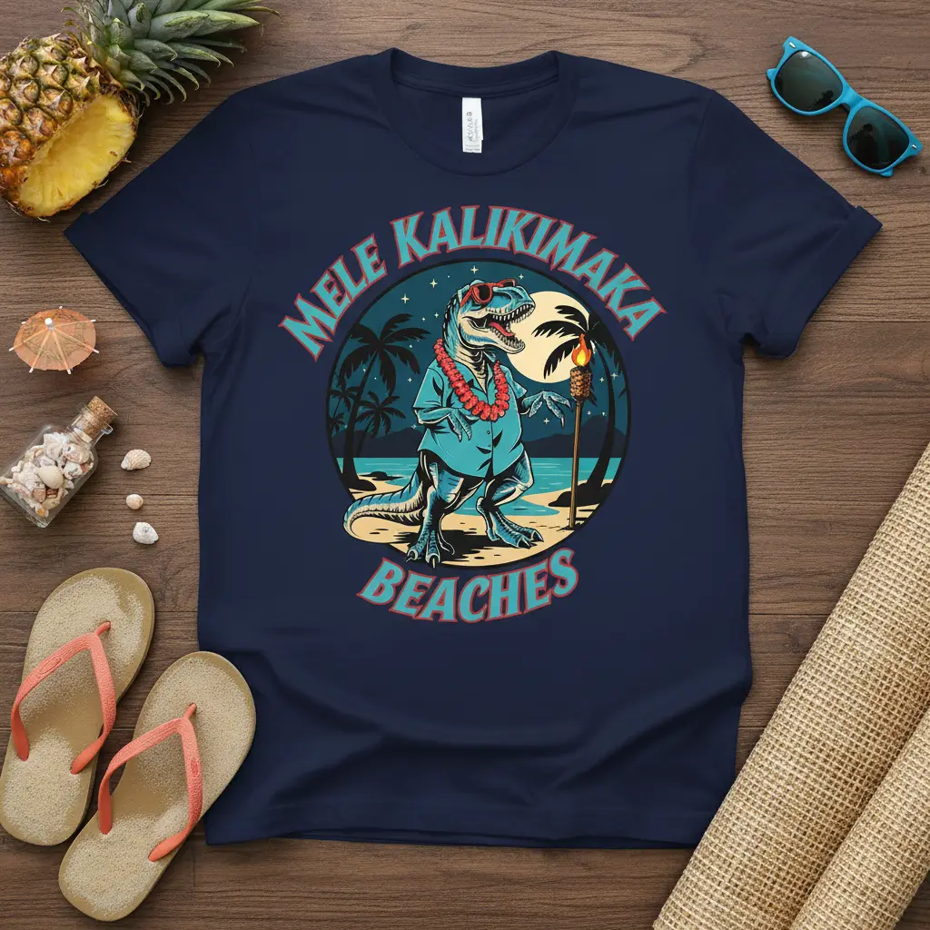 Imagine celebrating Christmas on a warm, sandy beach, complete with palm trees swaying and a cool breeze. This t-shirt brings that dream to life with its playful depiction of a dinosaur enjoying a tropical holiday. The “MELE KALIKIMAKA BEACHES” slogan is more than just text; it’s an invitation to a fun and festive celebration. It’s designed for those who prefer sunshine over snow and want to add a unique twist to their holiday wardrobe. This graphic tee is sure to become a favorite for all your casual holiday gatherings.