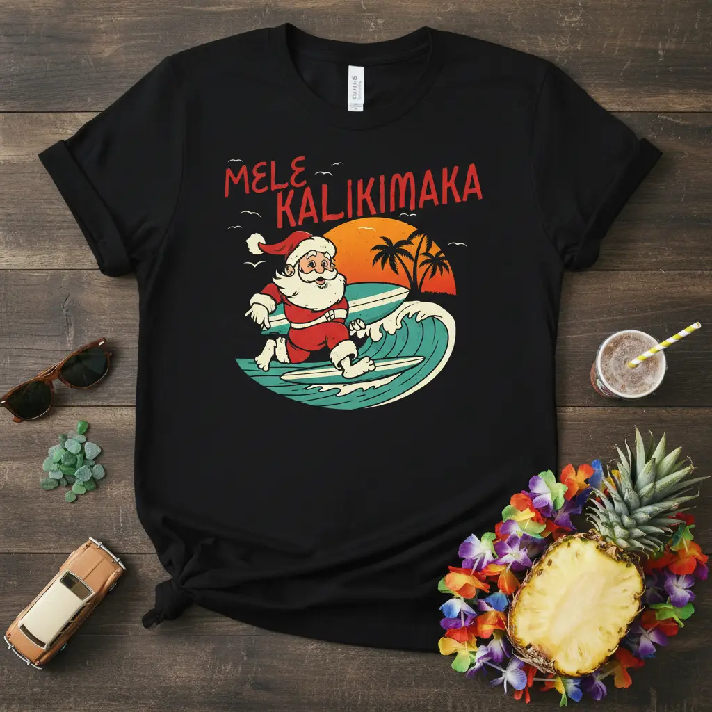 Mele Kalikimaka is more than just a greeting; it’s an invitation to embrace the joy and spirit of the holiday season with a tropical flair. This unique t-shirt captures that essence perfectly, featuring a delightful design that blends classic Christmas cheer with the laid-back vibes of a Hawaiian beach. Imagine Santa Claus trading his sleigh for a surfboard, riding a wave under a vibrant sunset, all while the festive phrase “Mele Kalikimaka” arches above. It’s a playful and memorable way to celebrate the holidays, making it an ideal addition to any festive wardrobe or a thoughtful gift for friends and family who love a unique twist on tradition.