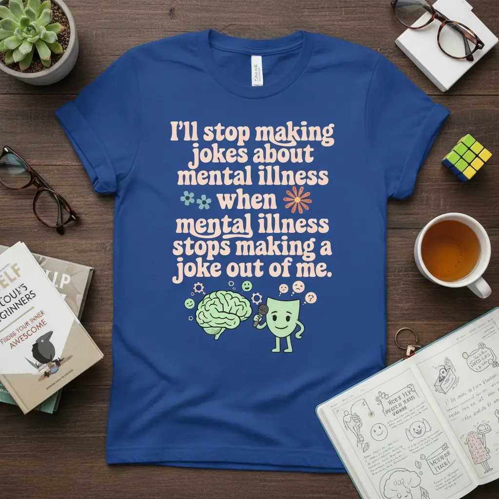 This “I’ll stop making jokes about mental illness when mental illness stops making a joke out of me” t-shirt is a bold statement for mental health awareness. Featuring a unique brain and character graphic, this comfortable tee sparks important conversations and shows your support. It’s a perfect way to express yourself and advocate for mental well-being.