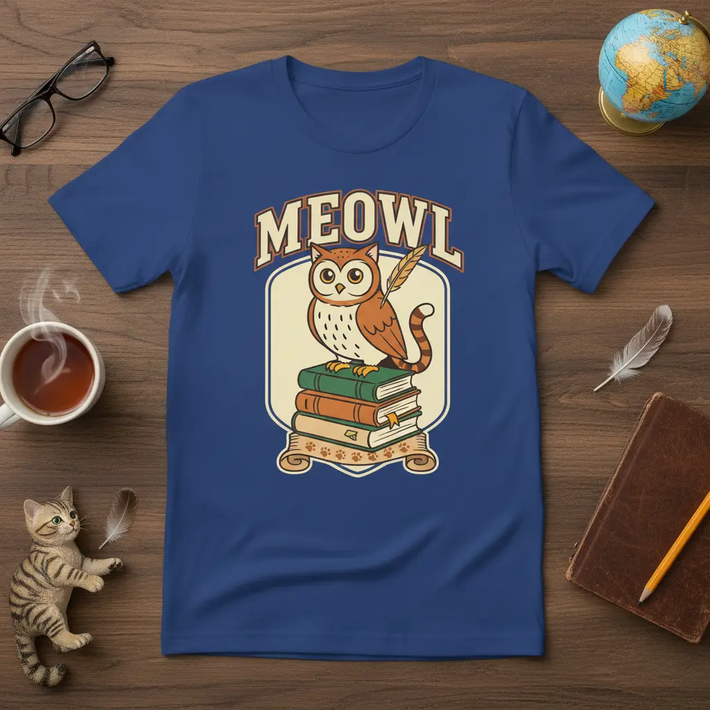 The “MEOWL” text, presented in a bold, collegiate font, perfectly complements the illustration. It’s a clever pun that instantly communicates the essence of the design. This tee is an excellent conversation starter and a fantastic way to showcase your unique personality and interests. Whether you’re a dedicated reader or simply adore whimsical animal mashups, this shirt is sure to bring a smile to your face.