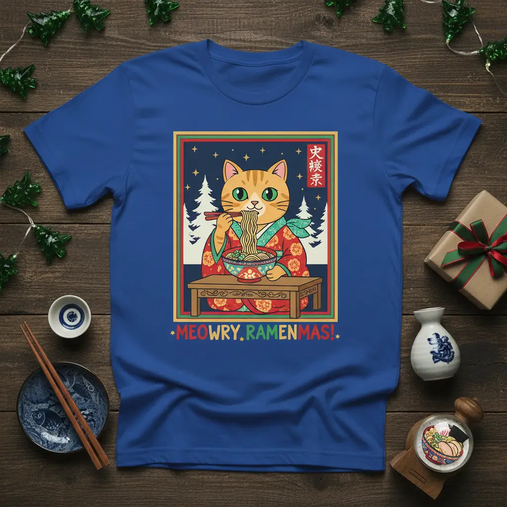 This eye-catching “Meowry Ramenmas” t-shirt showcases a heartwarming scene that perfectly encapsulates the joy of the holidays and the love for ramen. The central illustration features a cute cat, adorned in a beautiful kimono, expertly slurping noodles with chopsticks. Its cheerful expression and the cozy atmosphere created by the snowy background and starry sky evoke a sense of warmth and festivity. The playful text “MEOWRY.RAMENMAS!” ties the cat-themed pun with the holiday spirit, making it a memorable and fun statement piece.