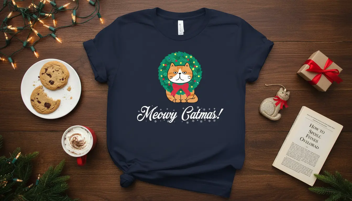 Pick from Black, Navy, Royal, Dark Heather, Red, and White to match your mood and wardrobe staples. Each colorway keeps the Meowy Catmas! design clear and photo-ready for everyday wear.
