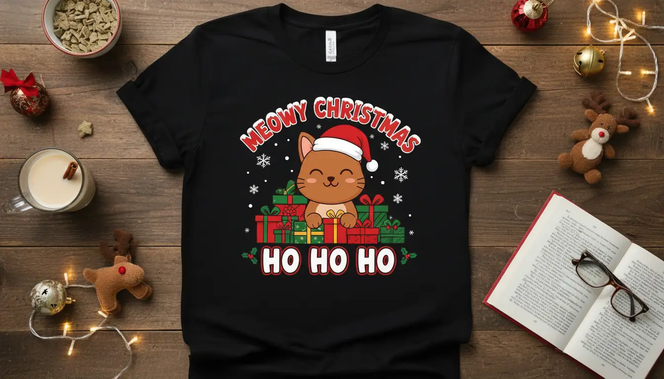 This “Meowy Christmas Ho Ho Ho” t-shirt is more than just holiday attire; it’s a conversation starter and a mood booster. Its playful design and cheerful message are sure to bring a smile to your face and those around you. It’s the perfect companion for holiday parties, family gatherings, or even just a cozy day at home enjoying the festive atmosphere. This shirt embodies the joy and lightheartedness of the Christmas season.