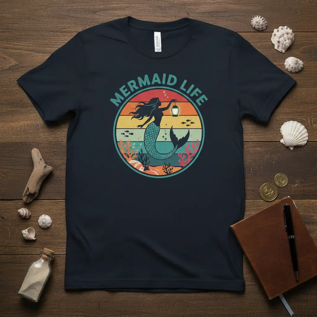 Mermaid Life is more than just a phrase; it’s a feeling, a dream, and a captivating lifestyle embraced by those who are drawn to the magic of the ocean. This enchanting t-shirt design perfectly encapsulates that allure, featuring a mesmerizing vintage retro sunset that evokes the mystery and beauty of the sea. It’s designed for anyone who feels a deep connection to the ocean’s depths, its creatures, and the legends that surround them. Imagine yourself by the water, feeling the gentle breeze and the warmth of the sun, all while wearing a piece that speaks to your soul. This shirt is a wearable escape, a reminder of the enchanting world that lies beneath the waves.