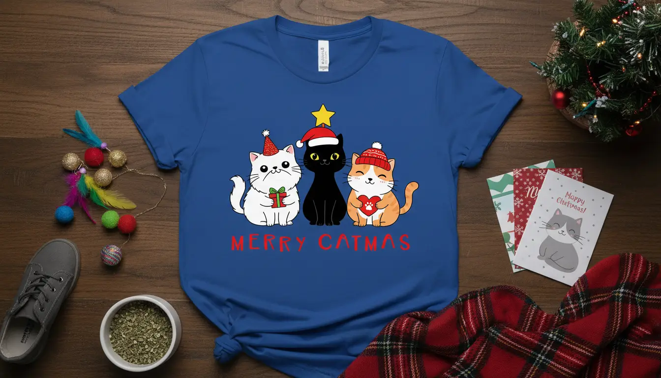 Merry Catmas is the perfect sentiment for any cat lover looking to add a touch of festive cheer to their holiday wardrobe. This charming design features three adorable cats, each dressed in their holiday best, ready to celebrate the most wonderful time of the year. It’s more than just a shirt; it’s a declaration of love for our feline friends and the magic of Christmas. Embrace the joy and warmth of the season with this uniquely designed tee, guaranteed to bring smiles and festive spirit to everyone who sees it. This design is crafted to be a delightful addition to any holiday gathering or casual wear during the winter season.