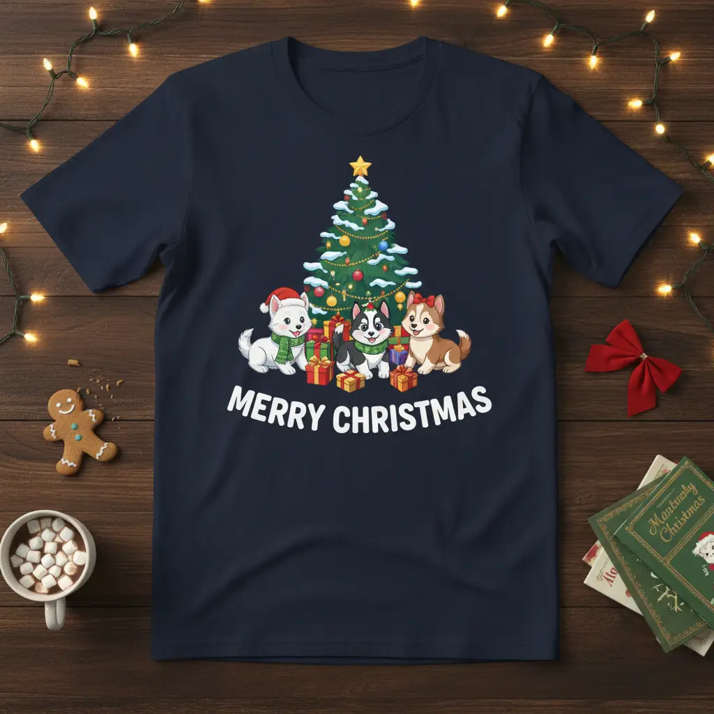 MERRY CHRISTMAS to all the dog lovers out there! This t-shirt is designed to bring a smile to your face and spread holiday cheer wherever you go. Featuring a heartwarming scene of adorable husky puppies gathered around a beautifully decorated Christmas tree, it’s the perfect way to showcase your love for dogs and the festive season. The vibrant graphics and cheerful text make this tee a standout piece for any holiday gathering or casual wear throughout December.