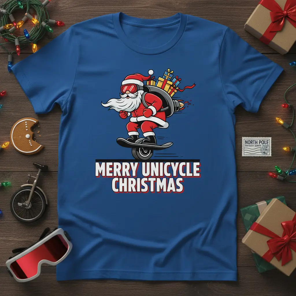 Merry Unicycle Christmas is more than just a slogan; it’s a statement for the modern, fun-loving holiday enthusiast. This unique t-shirt design captures the spirit of the season with a playful twist, featuring Santa Claus embracing a new mode of transport. It’s perfect for anyone who appreciates a blend of traditional Christmas imagery and contemporary humor. Whether you’re attending a holiday party or just spreading cheer, this shirt is sure to turn heads and spark conversations.