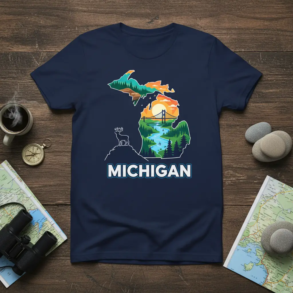 The detailed artwork within the Michigan map invites you to imagine yourself amidst its natural splendor. The inclusion of the bridge and the deer adds a touch of wilderness and iconic landmarks, appealing to adventurers and nature lovers alike. This Michigan State Map Graphic T-Shirt design isn’t just apparel; it’s a wearable piece of art that tells a story of the state’s captivating geography and spirit. It’s a thoughtful gift for birthdays, holidays, or as a souvenir to remember a special visit to Michigan.