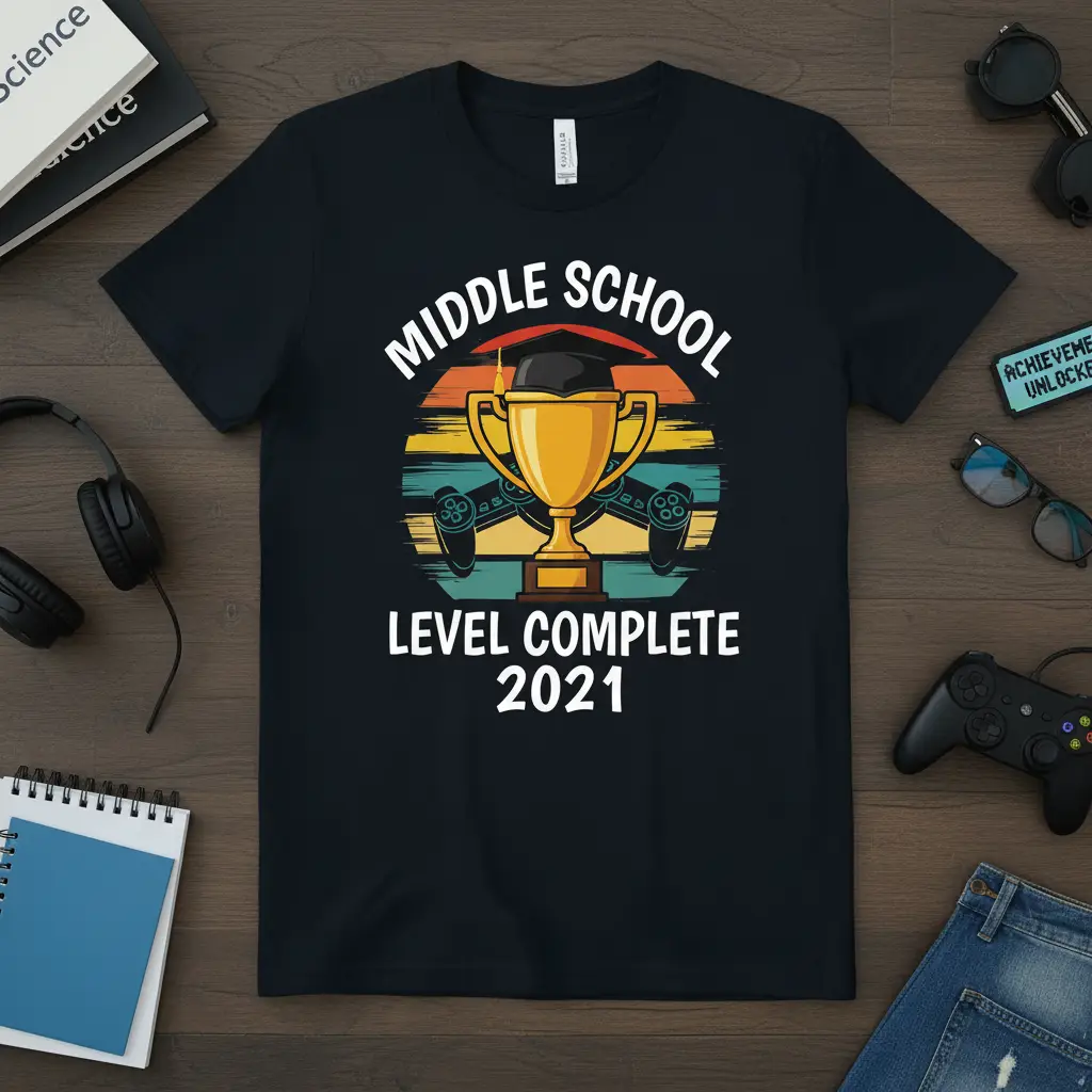 The visual elements on this tee perfectly blend academic achievement with the fun of gaming. A gleaming golden trophy symbolizes the ultimate prize, while the graduation cap represents the formal recognition of their hard work. The inclusion of video game controllers adds a unique, modern twist, celebrating the interests of today’s students. This combination creates a powerful and relatable image for anyone who has successfully navigated the challenges of middle school.