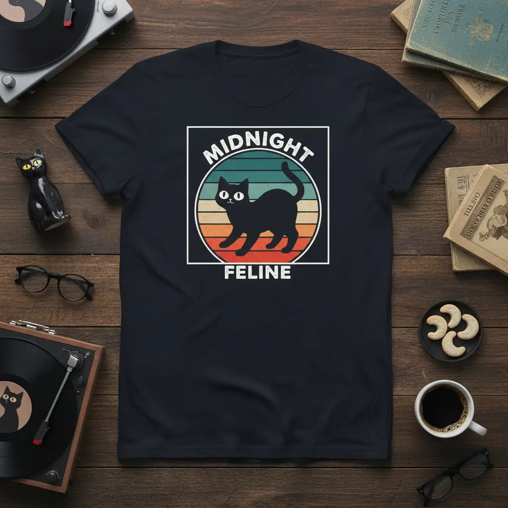 The “Midnight Feline” design is a carefully crafted illustration that appeals to a wide audience. It features a stylized black cat, depicted in a walking pose, with large, expressive eyes. This feline is set within a circular motif reminiscent of a setting sun, complete with bold, retro-style stripes in warm oranges, yellows, and cool teal tones. The text “MIDNIGHT” arches above the cat, and “FELINE” sits beneath it, all encased within a clean, white square border that frames the artwork beautifully.
