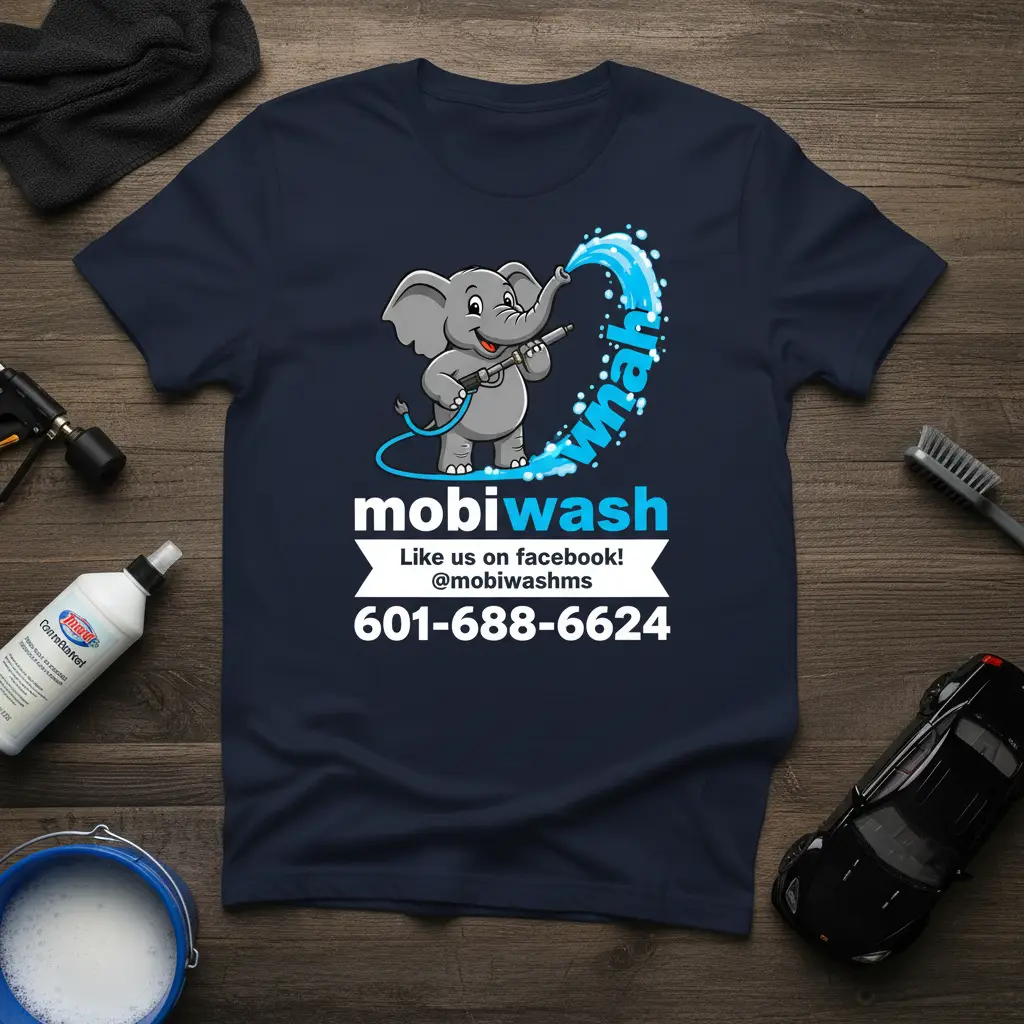 This t-shirt is a fantastic tool for brand recognition within the competitive car wash industry. The charming elephant graphic is memorable and appealing, while the prominent display of “mobiwash” ensures your business name sticks in customers’ minds. Including your social media handle and phone number directly on the shirt makes it incredibly convenient for interested individuals to reach out and book your services. It’s designed to be both eye-catching and informative, serving your marketing needs effectively.