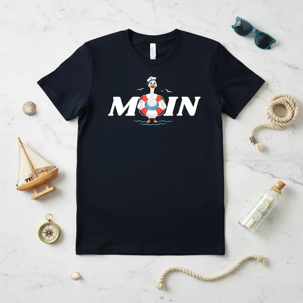 This eye-catching t-shirt features the word “Moin” in bold, crisp white lettering, creating a strong visual impact. Centered within the design is an adorable cartoon duck, fully embracing the sailor life. It sports a classic captain’s hat and a bright red and white life preserver, standing proudly amidst gentle waves. This playful imagery instantly conveys a sense of coastal charm and maritime adventure.