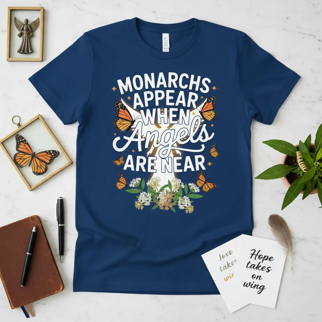 Monarchs Appear When Angels Are Near, this sentiment resonates deeply with those who find beauty and meaning in the natural world and the unseen forces that guide us. This t-shirt is more than just apparel; it’s a wearable piece of inspiration, designed to bring a sense of peace and wonder to the wearer and those around them. Featuring a captivating design that blends the ethereal beauty of monarch butterflies with the comforting notion of angelic presence, it serves as a gentle reminder that hope and guidance are often closer than we think.