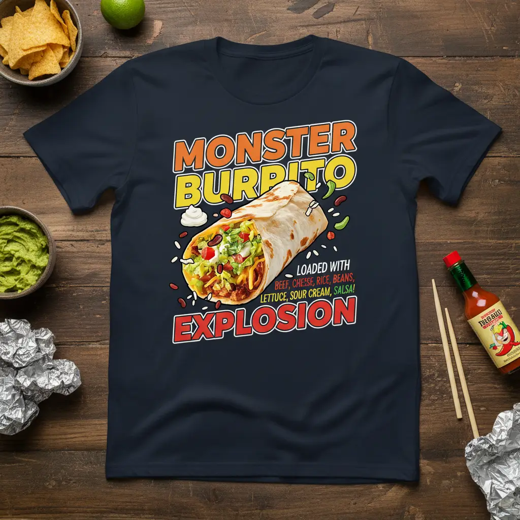 The “Monster Burrito Explosion” graphic is meticulously detailed, from the perfectly grilled tortilla to the generous fillings spilling out. The accompanying text highlights the delectable components, ensuring that everyone knows what makes this burrito truly monstrous. It’s a conversation starter that’s as fun to wear as it is to look at.