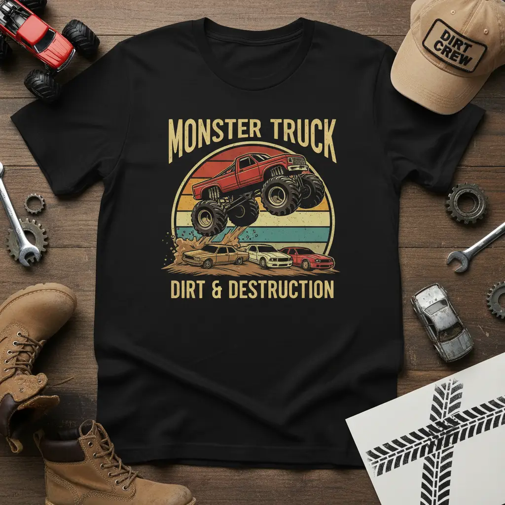 MONSTER TRUCK DIRT & DESTRUCTION is more than just a t-shirt; it’s a statement for those who live for the roar of engines and the thrill of extreme automotive sports. This design captures the raw energy and excitement of monster truck rallies, bringing the spectacle right to your wardrobe. It’s crafted for comfort and durability, ensuring you can wear your passion proudly. Whether you’re at a show or just out and about, this tee is sure to turn heads and spark conversations with fellow enthusiasts.